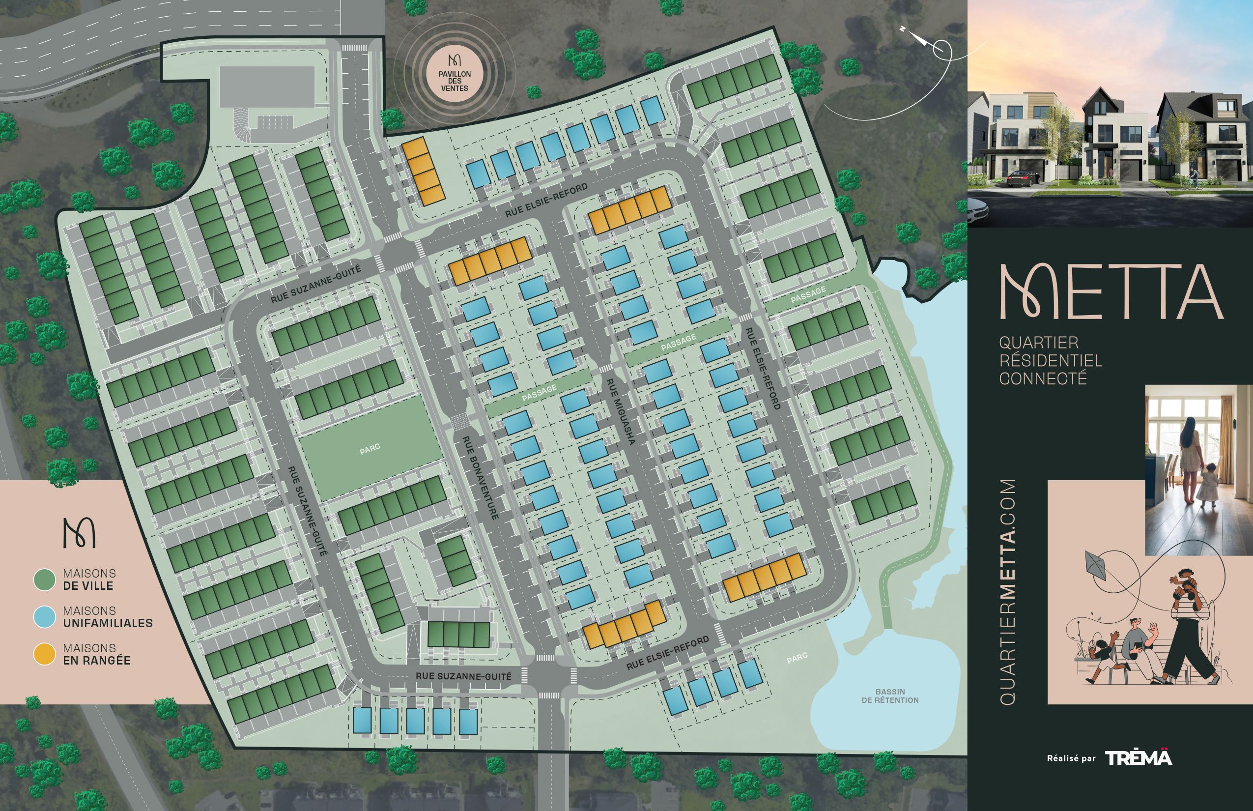 Le Quartier Metta offre une collection de modèles de maisons neuves uniques, conçus par le Groupe TRÉMÄ. Que vous recherchiez une maison de ville, une maison unifamiliale ou une maison en rangée, nous avons le modèle parfait pour vous. Chacune d’elles présente une architecture cohérente, conçue pour traverser les années avec élégance.